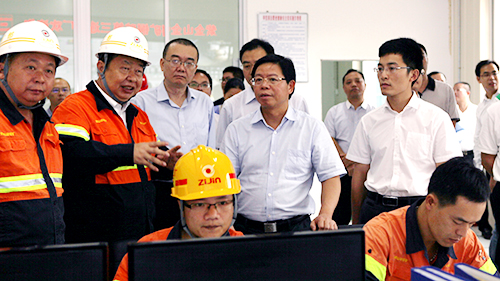 温锡浩、何明华、王波等市、县领导以及紫金矿业集团董事长陈景河、副总裁邹来昌等一同前往检查。