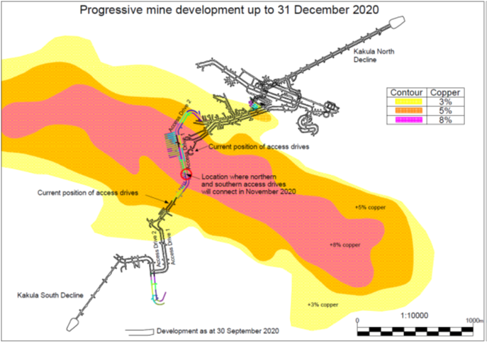 图2:截至9月底已完成的地下开拓工程 (黑色),以及计划在截至2020年12月31日止三个月内进行的矿山开拓工程。这段期间,大部分开拓工程将在卡库拉高品位矿区 (铜品位8%以上) 的首个分层充填采矿区进行。