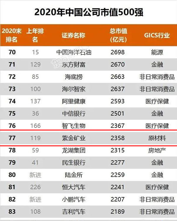 本网讯 近日,2020中国上市公司500强榜单揭晓,紫金矿业以2358亿元市值领衔国内有色企业,位列榜单第77位,较去年跃升42位。