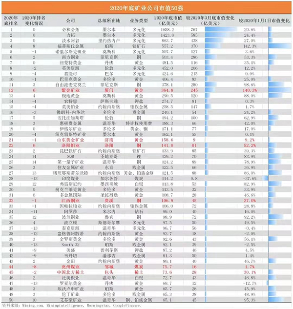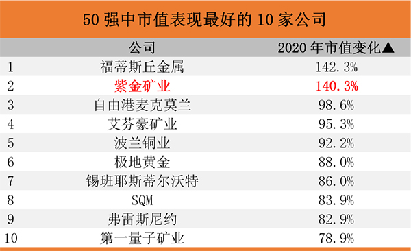 本网讯 1月7日晚,MINING.COM发布全球矿业公司50强榜单,根据2020年12月31日市值,紫金矿业以364.8亿美元(折合人民币2358亿元)位居榜单第12位,较去年同期前进6位,并继续蝉联上榜的中资企业榜首。公司同时以140.3%的超高增长幅度位居榜单中表现最好的10家公司第2位。