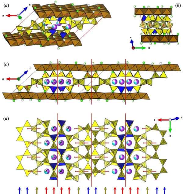 美夫硅铁石为T-O-T型层状硅酸盐(图1),三斜晶系,空间群P`1,晶胞参数:a=22.7773(13) Å, b=9.5553(5) Å, c=14.3282(8) Å, α=99.258(4)°, β=136.750(3)°, γ=89.899(4)°, V=2077.9(2) Å3.