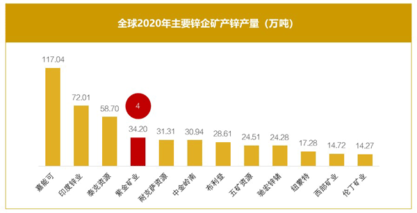 紫金矿业锌资源总量超过1000万吨,位居全球主要上市锌企第6位;2020年公司矿产锌34万吨、位居全球第4位;2021年前三季度,公司矿产锌29万吨、同比增长17%,冶炼产锌23万吨、同比增长49%。目前,锌板块规模约占公司总资产的9%、总营收的4.5%。