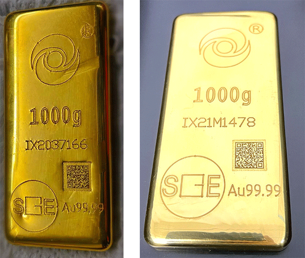 根据市场信息反馈,近期在上海黄金交易所场外仍有部分不法商家在制造和流通无防伪码、标识为机械冲压、编号不符合上海黄金交易所编号规则的假冒“紫金”牌标准金锭(图1.所示)。