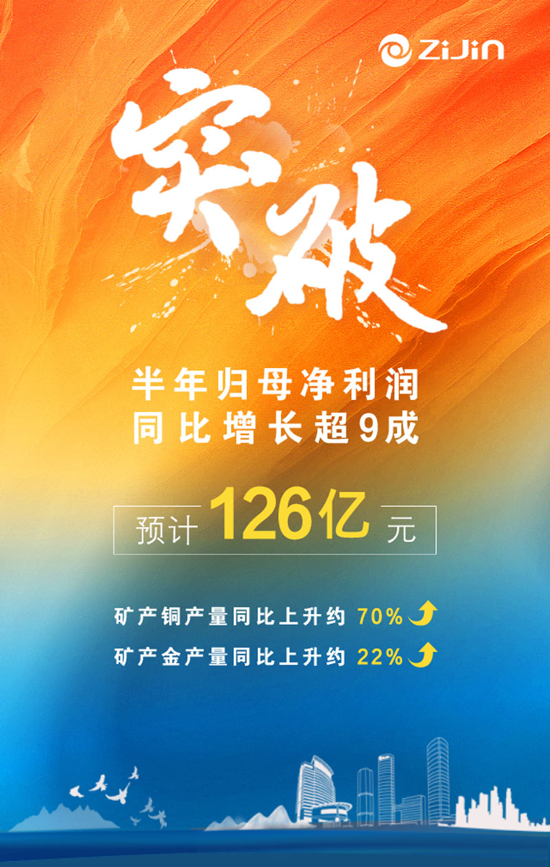 紫金矿业半年归母净利润预计126亿元,增幅超九成