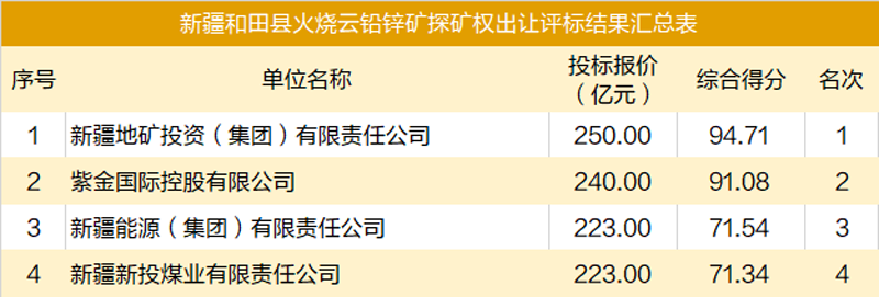 本网讯 119日,新疆公共资源交易网发布《新疆和田县火烧云铅锌矿探矿权出让招标结果公示》。紫金矿业全资子公司紫金国控以投标报价240亿元、综合得分91.08分,憾居第二、未能夺标,公司对未能中标这一全球罕见的世界级高品位矿床表示遗憾,对夺得首魁的新疆地矿表示祝贺。