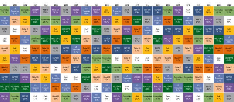 黄金,意料之中,但也意出望外。意料之中在于,高通胀和地缘政治风险对黄金绝不是坏消息,黄金发挥了危机场景下一如既往稳定器的作用,年底伦敦金收于1823美元/盎司,全年仅跌0.8%,大幅跑赢除商品和现金外的其他金融资产。意出望外在于,在历史级别的激进加息背景下,金价表现超出了部分投资机构的预期,也超出了传统指标所指引的波动区间。