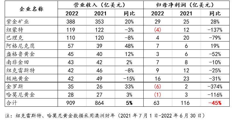 图表7:全球头部黄金企业2022年营业收入、归母净利润情况