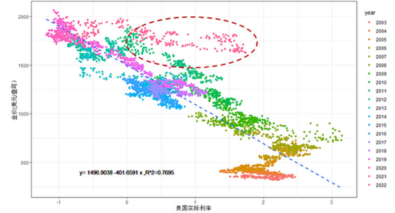 图表2:2003-2022年实际利率-伦敦金线性回归;注:横轴为美国10年期TIPS收益率,纵轴为美元金价(资料来源:中金公司研究部)