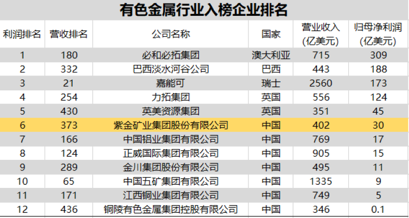 在入榜的12 家全球有色金属矿业中,紫金矿业位居全球有色金属矿企第6位、中国金属矿企第1位,必和必拓、淡水河谷、嘉能可利润分别位列全球前三。