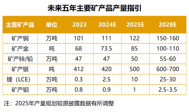 此外,公司规划2025年、2028年矿产金分别为85吨、100-110吨;矿产锌(铅)分别为50万吨、55-60万吨。