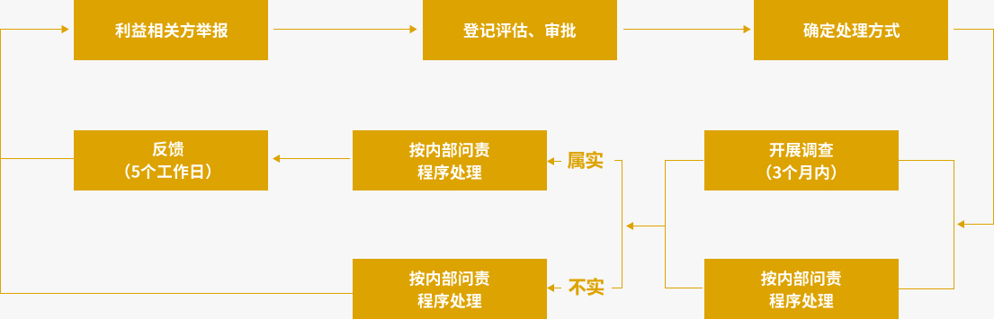 我们为利益相关方提供了申诉与举报机制,适用于所有利益相关方群体,涵盖公司所有经营活动,并通过《举报管理政策声明》和《举报管理办法》对举报工作进行了规范,以确保利益相关方的诉求能得到及时有效的处理,保障申诉人权益,规范申诉处理工作。