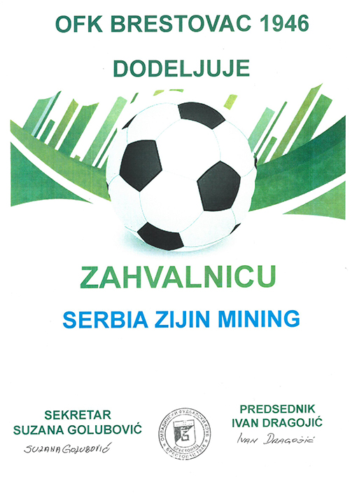 本网讯 日前,由塞尔维亚紫金矿业赞助的布雷斯托瓦茨足球队在波尔市足球联赛取得佳绩,在16只参赛队伍中位列季军。6月13日,布雷斯托瓦茨足球俱乐部专程致信塞紫金,感谢公司给予的支持。
