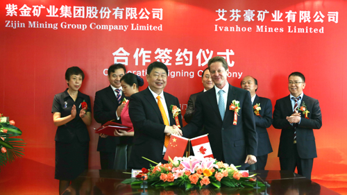 5月26日,紫金矿业与艾芬豪和巴里克两大国际矿业巨头“握手”,结成战略合作关系,联手开发世界级超大铜矿、金矿。双方约定,紫金矿业取得艾芬豪旗下的世界级超大未开发铜矿刚果(金)卡莫阿铜矿49.5%的股权和巴里克旗下大型在产金矿巴新波格拉金矿50%的权益,两个矿山的铜、金资源储量分别为2416万吨、285吨。