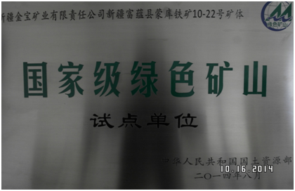 金宝公司还加大安全标准化建设和清洁生产工作,并取得了一系列的成果。公司于2011年12月通过了清洁生产评审工作;2013年取得了露天矿山、尾矿库安全生产标准化二级资质;2014年9月取得了选矿厂、初选厂安全生产标准化二级资质。2014年9月中旬国土资源部于授予我公司“新疆金宝矿业有限责任公司新疆富蕴县蒙库铁矿10-22号矿体国家级绿色矿山试点单位”荣誉称号。