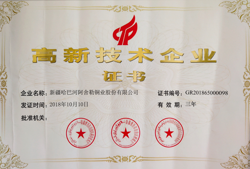 本网讯 近日,新疆维吾尔自治区2018年第二批高新技术企业名单公布,阿舍勒铜业榜上有名,这是阿舍勒铜业继2015年首次通过高新技术企业认证(有效期三年)之后连续迈入此行列。