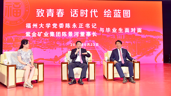 中新闻、新华网等主流媒体“目前,我国正积极推动‘一带一路’建设,我想请问陈景河董事长,大学生该如何融入到‘一带一路’倡议中,迎接矿业发展的新挑战、新机遇?”6月23日,福州大学紫金矿业学院2019年毕业典礼暨学位授予仪式在福州大学举行,福州大学党委书记陈永正,紫金矿业集团董事长、学院理事会理事长陈景河与毕业生们进行了面对面的交流。