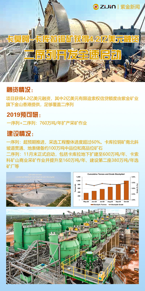 本网讯 日前,紫金矿业刚果(金)卡莫阿-卡库拉铜矿获得4.2亿美元项目层面融资,现金流大幅增加,项目二序列正式全速启动,预计完工时间将从2023年第一季度大幅提前至2022年第三季度。