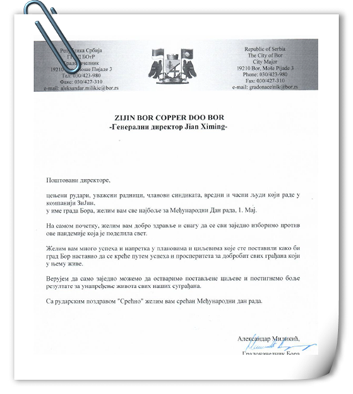 本网讯 5月1日,塞尔维亚波尔市市长亚历山大·米利基奇致信塞尔维亚紫金铜业,向劳动者致以节日的问候、崇高的敬意和美好的祝愿。