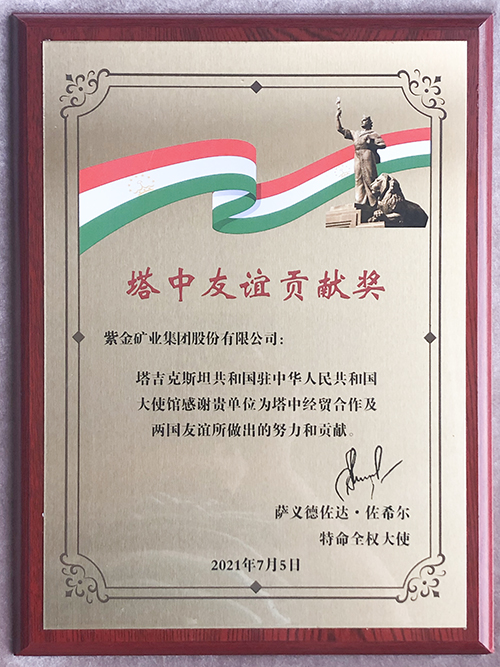 本网讯 7月5日,上合组织20周年:塔吉克斯坦共和国—中国-上合示范区交流活动在青岛举行。会上,塔吉克斯坦驻华特命全权大使萨义德佐达·佐希尔向紫金矿业等10家单位颁发“塔中友谊贡献奖”,对紫金矿业为塔中经贸合作及两国友谊做出的努力和贡献表示感谢。