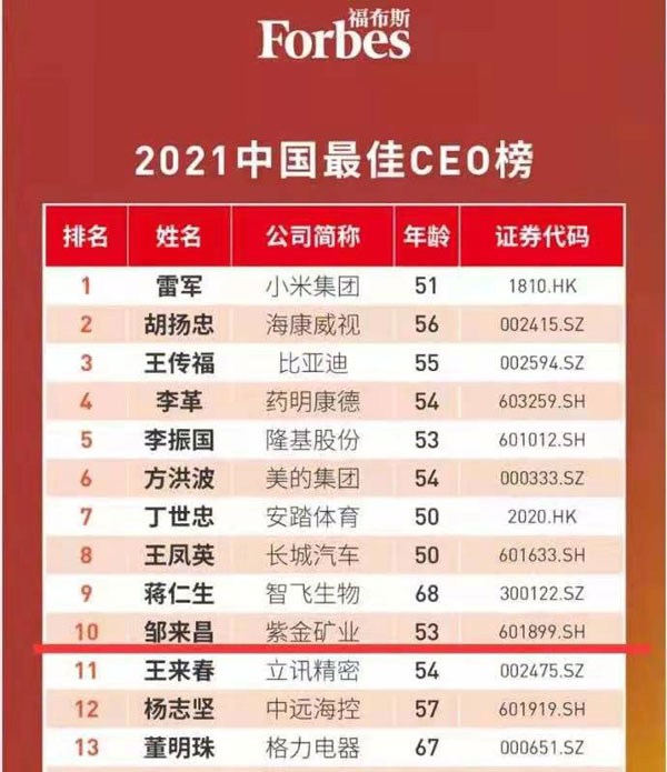 本网讯 7月15日,福布斯中国发布最佳CEO榜单,紫金矿业总裁邹来昌位列第10位,居入选矿业企业CEO之首。后疫情时代,全球经济修复趋势正在成就一批非凡的中国公司,本次共有50位CEO入选榜单。
