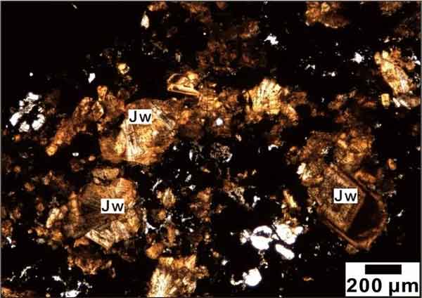 图2 景文矿显微镜下透射光照片(Jw=jingwenite)