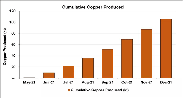 卡莫阿-卡库拉铜矿一期380万吨选厂已于2021年5月正式产出首批铜精矿,当年9月快速达到设计产能,创下新的“紫金速度”。一期选厂实际产能已高出设计产能15%以上,铜回收率持续攀升,总体超过设计回收率的86%。2021年卡莫阿-卡库拉铜矿共生产精矿含铜金属量达10.59万吨,远超当年计划的9.25-10万吨指标。