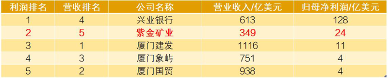 在上榜的145家中国公司(含港澳台)中,紫金矿业归母净利润位居第50,同时,紫金矿业净资产收益率(ROE)为24%,高于中国大陆(9.5%)、美国(21.9%)以及整体上榜企业的平均水平。福建企业还有厦门建发、厦门国贸、厦门象屿、兴业银行4家上榜,紫金矿业归母净利润位居福建企业第2。
