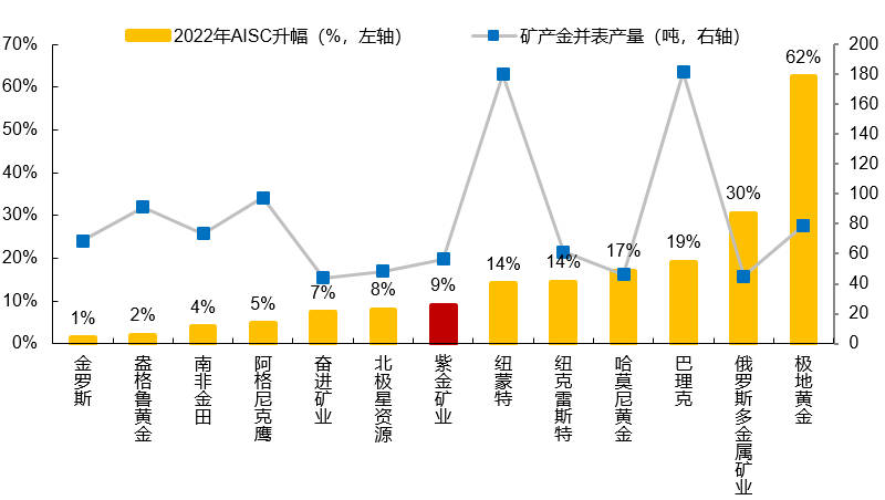 图表5:全球头部矿产金生产商2022年成本同比变化;注:紫金矿业为国内会计口径下的生产成本(资料来源:Metal Focus)