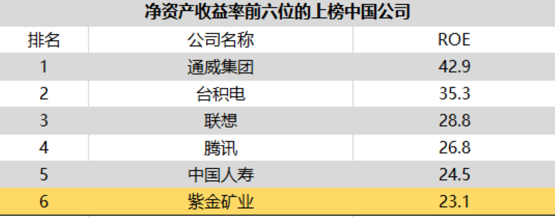 本次500强榜单中,中国企业上榜142家,公司数量继续位居各国之首。榜单中,紫金矿业归母净利润位居全球第231位、中国公司第38位、净资产收益率(ROE)在上榜中国公司中位列第6位。