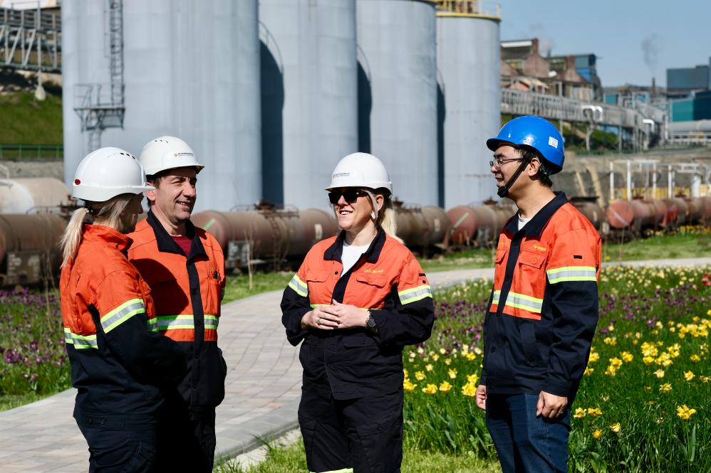 4月11日,在塞尔维亚东部博尔市,塞尔维亚紫金博尔铜业有限公司冶炼厂的员工在厂区内交谈。