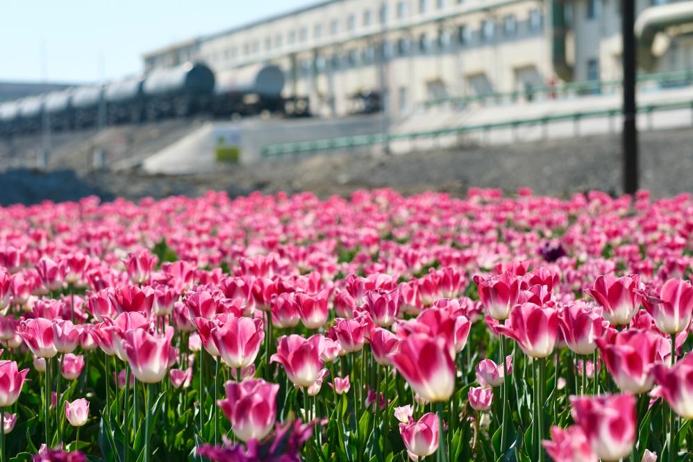 冶炼厂旁,一片绽放的郁金香田,在湛蓝的天空下显得格外艳丽。