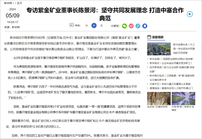 本网讯 连日来,作为中塞务实合作的代表企业,紫金矿业受到中塞主流媒体高度关注。国内主流媒体新华社、央视、新华网、福建发布等,塞尔维亚主流媒体塞尔维亚国家广播电台、《政治报》《信使报》、pink电视台、福布斯塞尔维亚网等超100篇次报道重点关注紫金。