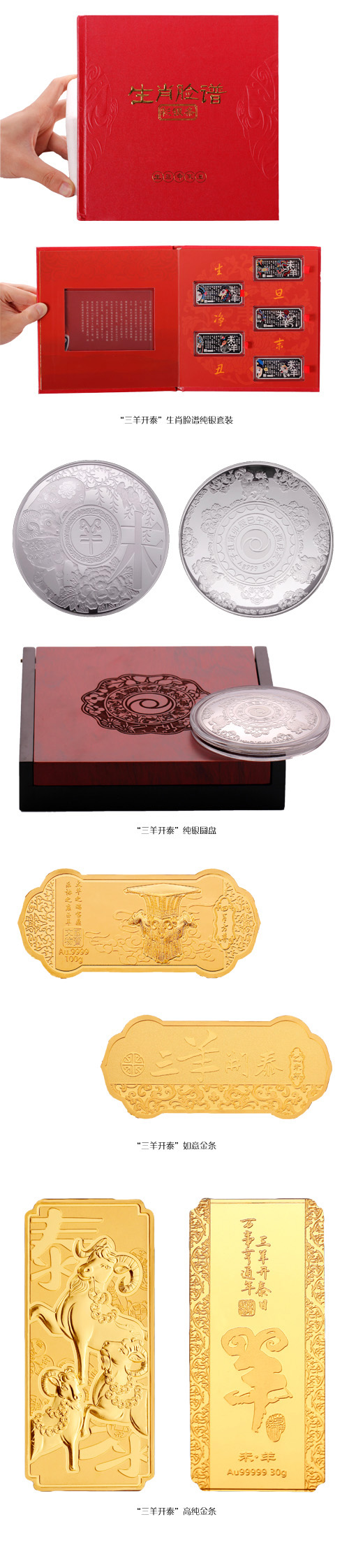 这4款分别是“三羊开泰”生肖脸谱纯银套装,成色AG999,规格50g/套、100g/套;“三羊开泰”纯银圆盘,成色AG999,规格50g/件;“三羊开泰”如意金条,成色AU9999,规格从10g-3000g不等,接受定制;“三羊开泰”高纯金条,成色Au99999,规格从10g-500g不等。