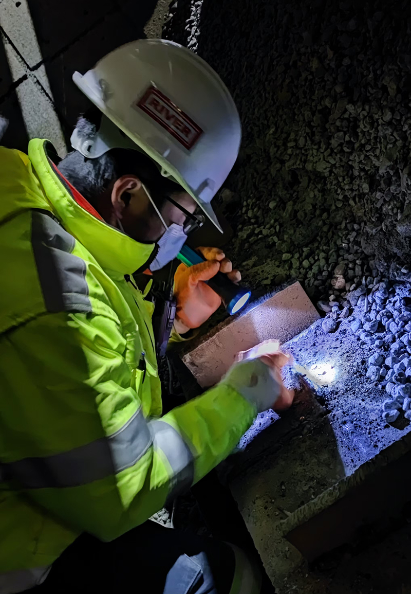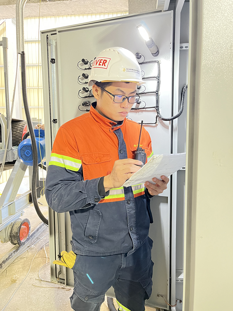 为了解决顽石皮带时常出现跑偏问题,我爬进泥泞且狭小的下料口内部,仔细测算实际落料点,精准确定缓冲积矿台的位置尺寸,打着手电敲击检查缓冲积矿台的每一道焊缝质量。高强度的工作曾让我累到发烧,在用新冠病毒咽试纸确认不是新冠病毒后,我长舒了一口气,又继续带领团队处理沃曼渣浆泵出现轴封水压力低与盘根漏浆的故障。