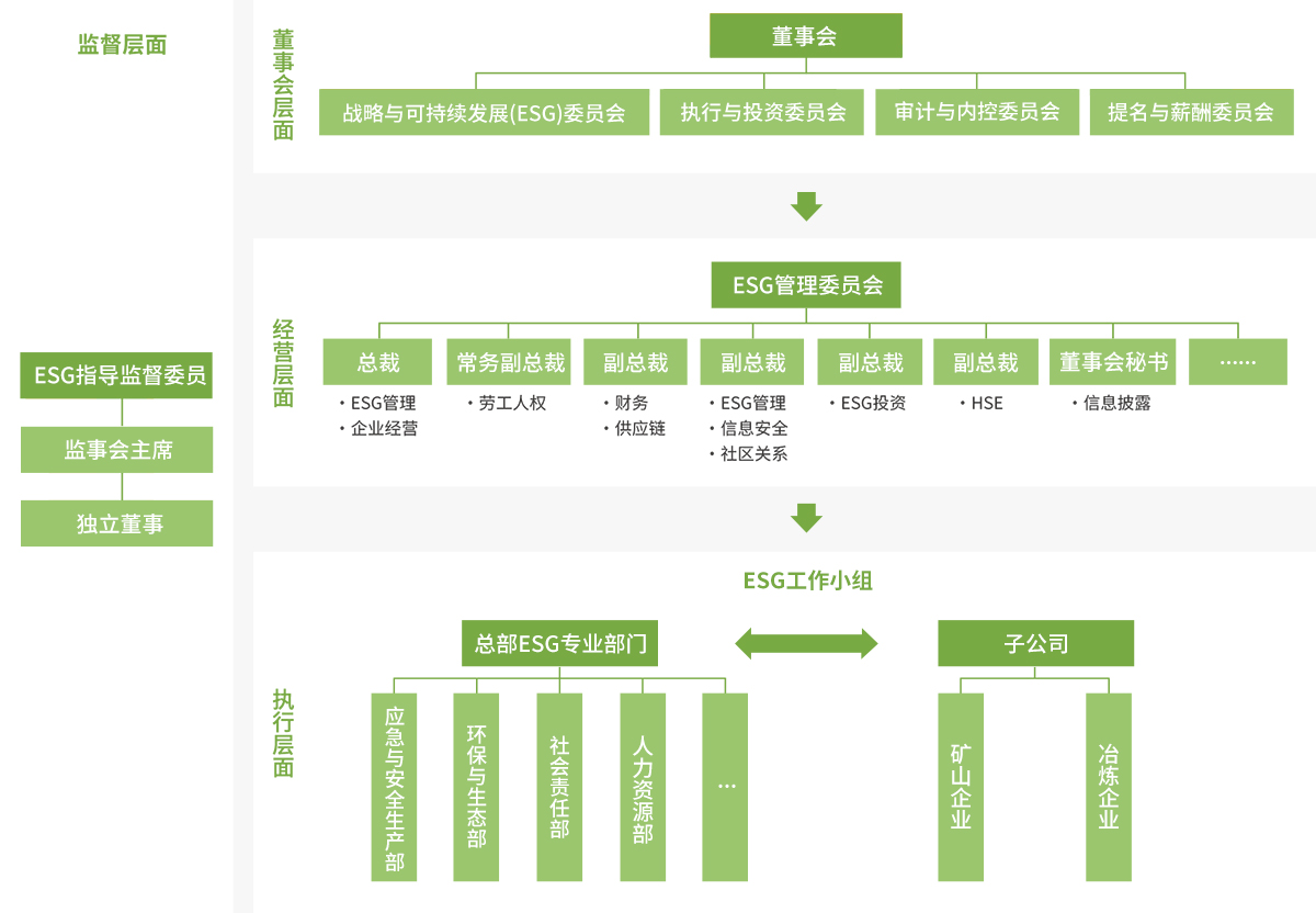 公司建有完善的ESG 治理结构,在董事会层面设四大委员会,在经营层设立ESG 管理委员会,总部各专业部门与子公司各专业部门形成自身ESG 管理专业网络,依托工作小组网络,我们将ESG 战略目标有效分解、政策要求快速下达,并形成动态、有效的风险防控和沟通机制,落地良好的ESG 实践。